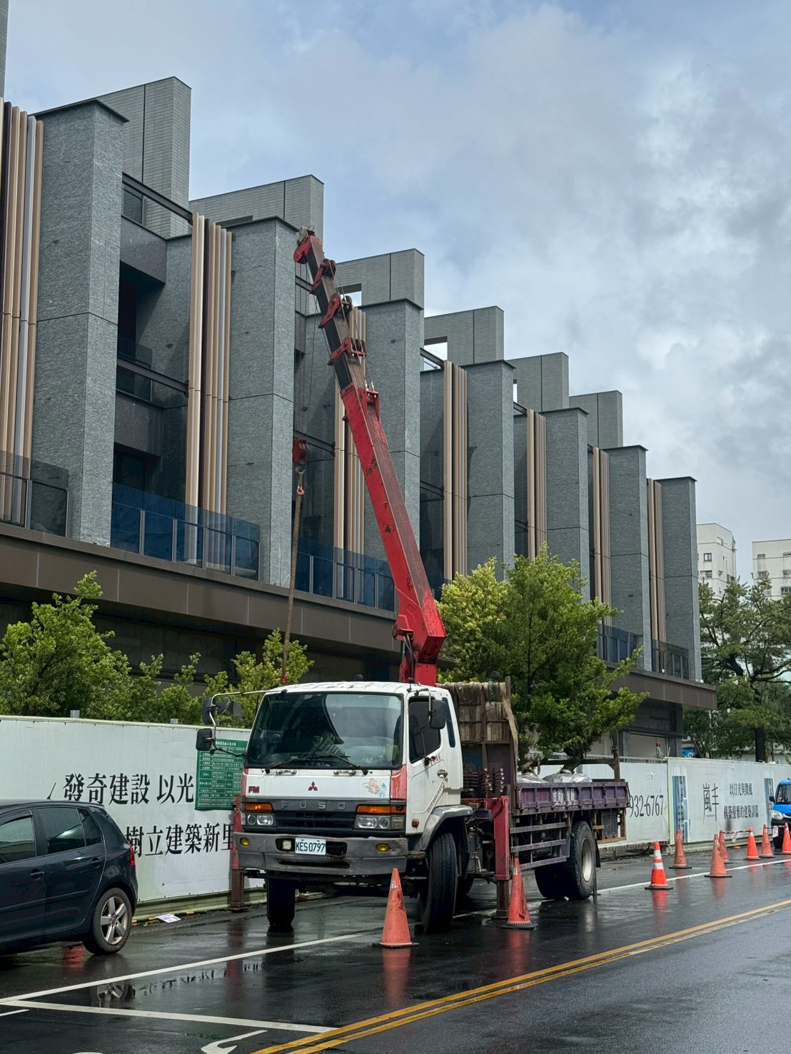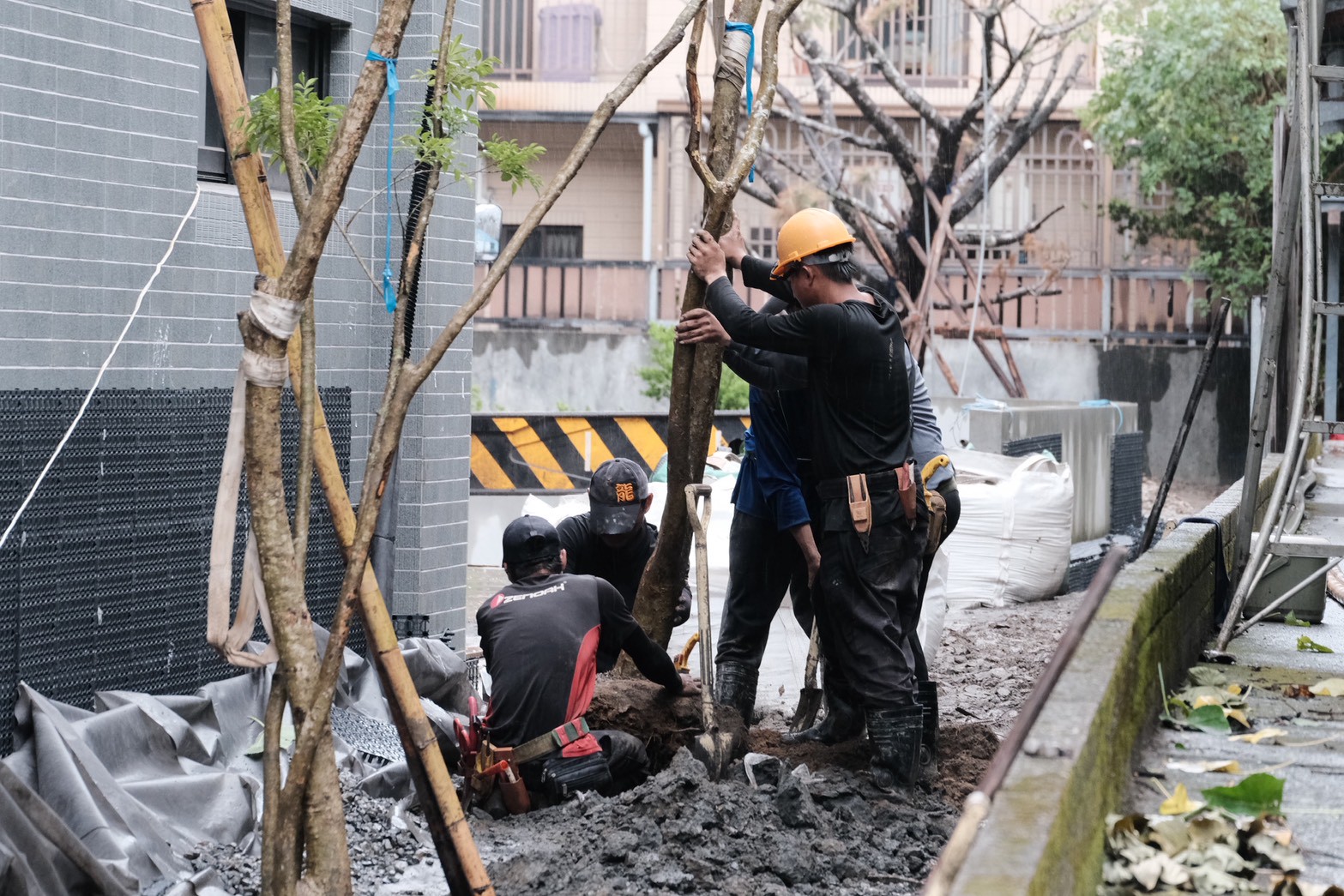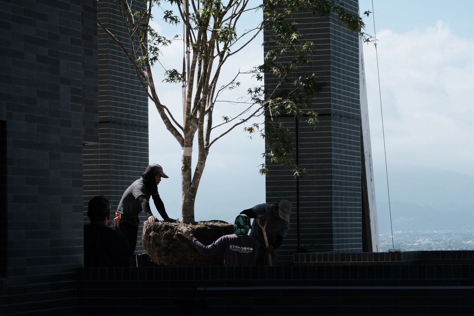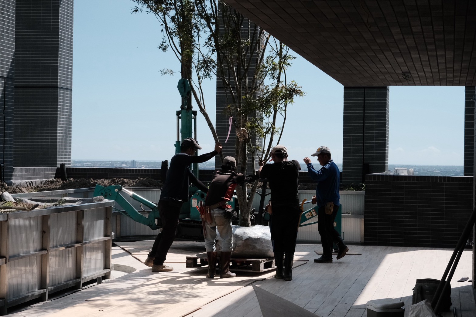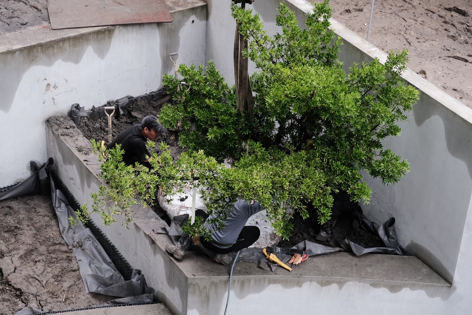 目前大喬木、小喬木正陸續進場施工,宜中路別墅區二樓陽台的羅漢松率先登場,頂樓空中花園的綠化工程也同步展開。
